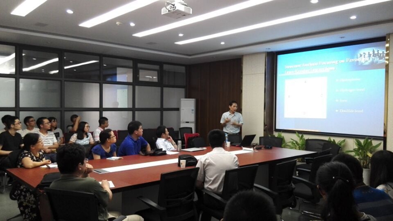 报告中,李志军博士从3个方面介绍了自己在化学信息学与生物化学领域的工作。在蛋白质结构建模的方法发展和应用方面,李志军谈到MRPS7蛋白残基突变对结构稳定性的影响及其与疾病之间的关联,并介绍了利用不同结构预测方法预测GPCR与配体互作方面的工作。随后,李志军谈到了如何整合利用Uniprot、ChEMBL等化学和生物学数据库,辅佐理性药物设计,并介绍了其开发的PyMine工具在这方面的具体应用。报告最后,李志军介绍了如何利用生物信息学方法对Porphyromonas Gingivalis基因组中二鸟苷酸环化酶进行预测。我院师生就报告内容与李志军博士进行了热烈交流与讨论。