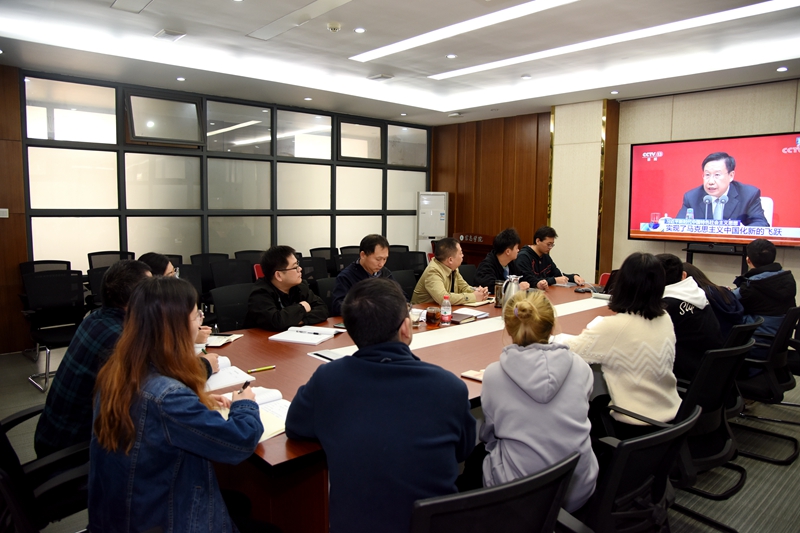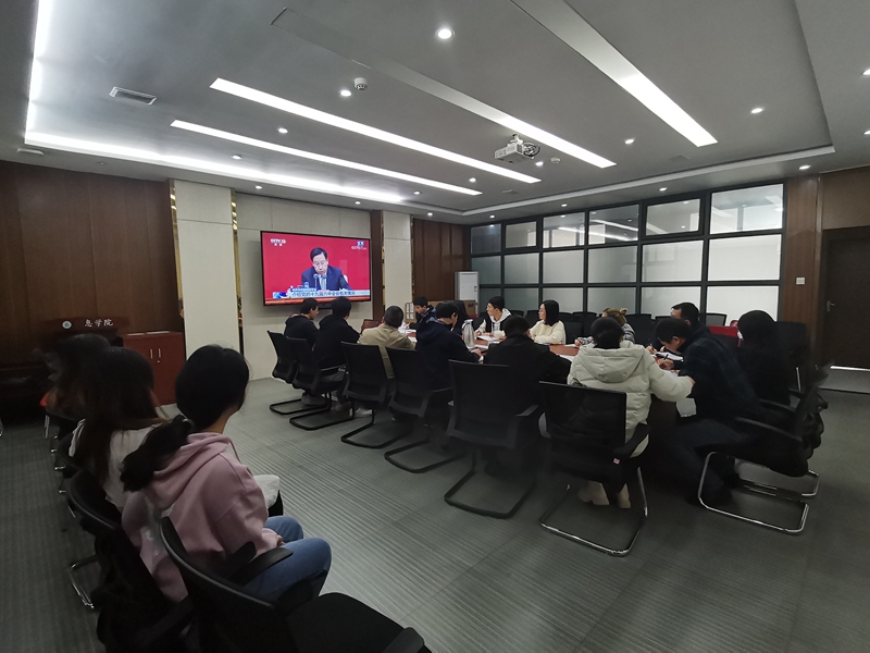 学院在逸夫楼C314会议室设置集中收看点。学院班子成员、党委委员、教工支部与学生支部党员代表、行政支部全体同志到场收看会议实况。