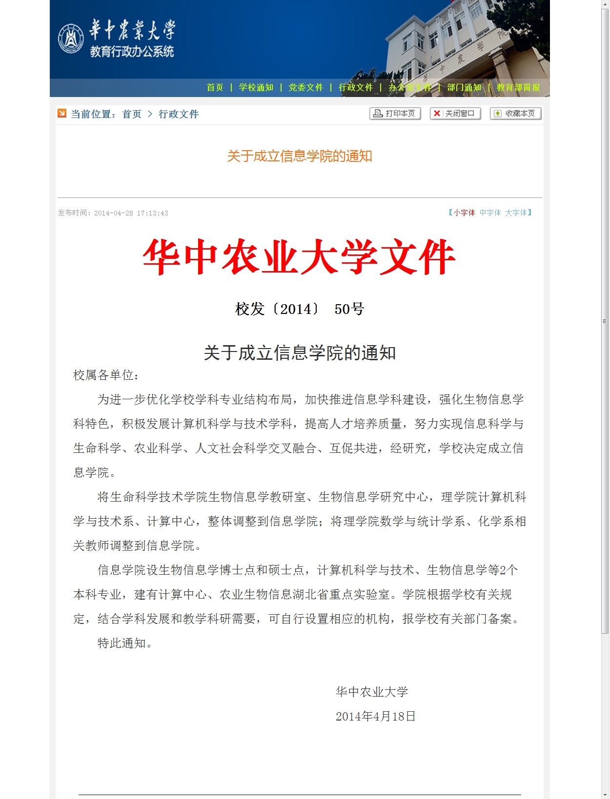 编者按:2014年,华中农大博中bz会员登录在全校师生的热切期盼中成立。从此,华中农业大学信息学科建设和发展进入了快车道。党的十八大以来的十年,博中bz会员登录始终以“为了人类心智的荣耀”为价值追求,坚持“入主流、强特色、创优势”的发展路径和“底层交叉”发展思路,执信拓新、自强不息,实现了从无到有,由小到大的发展成效,产出了一批科研成果,培育了一批信息类人才,有力支撑了学校“双一流”学科建设。值此党的二十大召开之际,我们通过一张张历史图片,回顾和重温学院筚路蓝缕、砥砺前行的发展足迹,从中汲取养分,努力奋斗,续写学院发展新篇章,创造新辉煌!