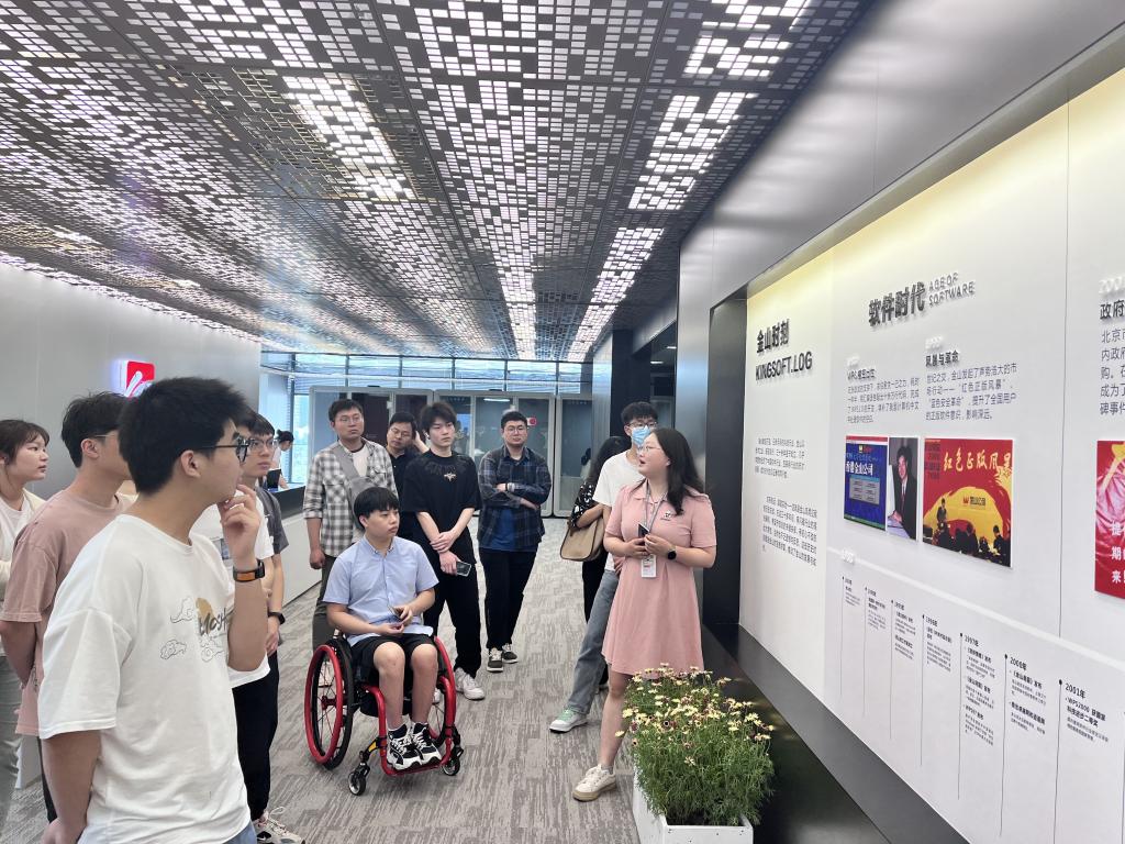 走进金山,第一个展区展示的是金山三十多年的发展历程。金山公司赵志梦为同学们讲述了“wps之父”、“中国第一程序员”求伯君的故事。伴着讲解声,一眼望去看到的是金山的整个历史长轴。走到下一个展区,历史就变得立体起来。这里展示的是金山办公重要的几个版本和历史节点,如果说之前展示的是金山的整个历史的长河,这里描绘的就是河流中湍急的几段。稳坐国内领域第一被冲击得摇摇欲坠、中国第一程序员被迫卖房开发——这些荣誉不是嘉奖,而是一枚枚军功章。与之相邻的是金山旗下负责游戏的西山居的展区,在金山最艰难的那段岁月,西山居的成功反哺了金山办公。