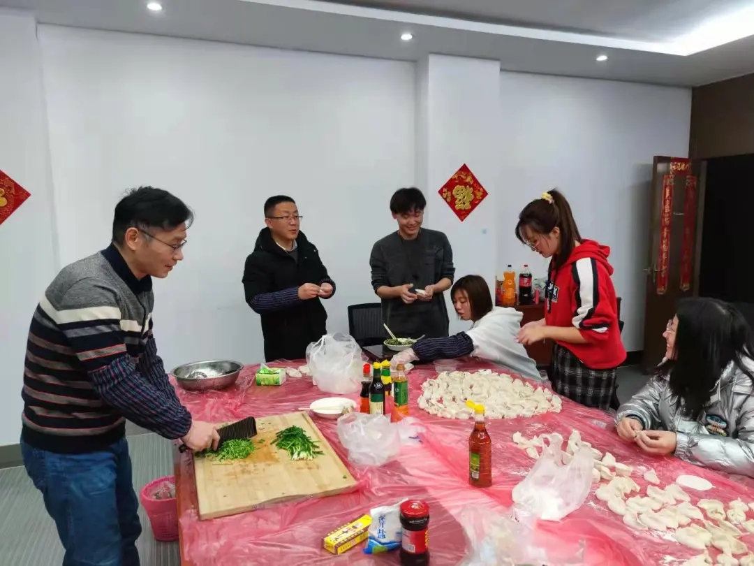 在喜庆快乐的气氛中,洗菜、切菜、和馅、调料、包饺、煮饺,大家各有分工,协调有序,喜笑颜开,房间里面充满笑语欢声。在包饺子过程中,大家相互交流着各地的过年习俗。郑学刚和李国亮老师亲切地了解学生的生活、学习和研究情况,温馨地给学生们讲起他们过年与求学的往事。四种馅,铺开摆满一桌的饺子,形状各异,百花齐放,展示出大家灵巧的手法,可谓是“八仙过海,各显神通”!