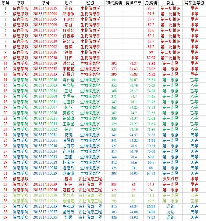 为做好2018级硕士研究生学业奖学金评审工作,根据《学校研究生学业奖学金管理办法(试行)》(校发[2014]109号)文件精神,《关于做好2018年硕士研究生学业奖学金评审工作的通知》(校发[2018]12号)等文件精神,结合学院实际,制定学业奖学金分配办法,评选结果如下: