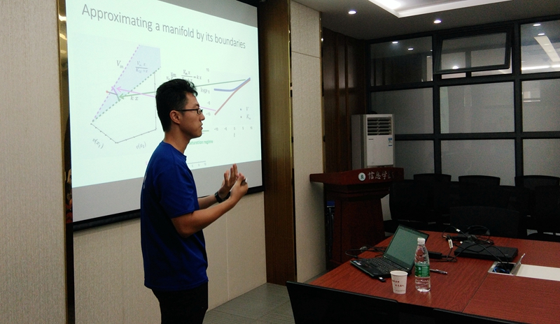 生物复杂系统如代谢网络、生物细胞、神经网络等方向的研究是目前系统生物学的前沿。黄磊博士报告中重点介绍了一种辅助研究生物复杂系统模型的方法, 称为流形边界逼近法 (Manifold Boundary Approximation Method,MBAM)。MBAM算法是通过减少参数数量衡量的自由度(degrees of freedom)同时维持原生物模型与简化后模型的机械关系的一种针对复杂系统模型的简化模型方法。MBAM算法将模型视为一个几何结构的流形体,所得到的简化模型能更好揭示微观的相互作用对整体系统行为的影响。此方法对许多生物系统模型具有适用性,可用于揭示生物复杂系统的一些重要问题。黄磊重点介绍了此方法在神经生长因子受体信号(nerve growth factor receptor signaling,NGFR)网络和光合代谢网络这两个生物系统模型的应用。此外, 报告中还交流了几何学主导的数学建模工作中的其它重要见解和研究成果。