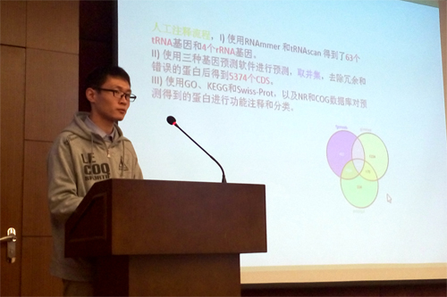 接着由博中bz会员登录多名优秀硕士和博士一一为在场师生作报告。第一场报告《联合特征驱动方法和模板方法预测蛋白质结构中的RNA结合位点》由杨晓霞主讲,介绍了如何预测RNA结合位点的方法及实验步骤。第二场报告《甜橙蛋白-蛋白相互作用网络预测》由常继伟主讲,就PPI的信息学算法和意义作了介绍,并详细解读了最终的数据。第三场报告《基于PheWAS鉴定TB抗性位点》由裴志华主讲,从问题出发,介绍了数据处理流程并对其进行了耐药性机制分析。第四场由郭静主讲有关“地衣杆菌的转录组和基因组注释”的报告,对地衣杆菌WX-02的转录组和基因组有着全面且详尽的解读。