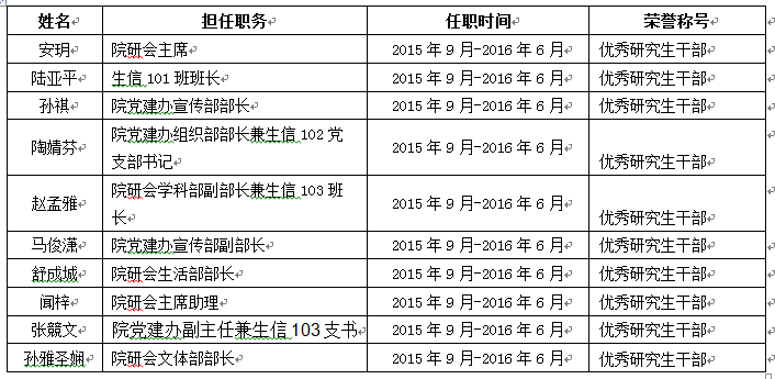 按照校研工〔2016〕13号文件精神,我院进行了优秀研究生干部评定工作,经个人申报,材料核查,最终评选出优秀研究生干部10名,现公示如下:
