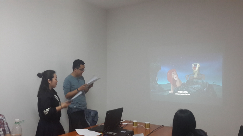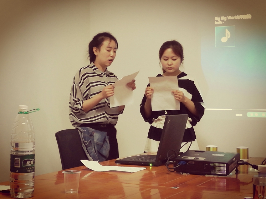 研二的张祎焜搭档研一的赵孟雅成为第一组表演者,他们的节目是电影配音类,声情并茂地为我们展示了《狮子王》中小王子辛巴在心灰意冷之际受到父亲鼓舞的经典片段;接下来,刘云霞和董田歌在轻快的伴奏下演唱了一首清新愉快的英文歌曲《big big world》,带动了一波观众的合唱,气氛好不热闹;杨植全和沈威则别出心裁地给国语电影《分手大师》配音,诙谐的口语逗得观众忍俊不禁;杨倩、刘梦苑和马俊潇找来了极具美国特色的动画短片《线人》和《通灵师》,动画本身幽默精简的剧情结合抑扬顿挫的语调,一度把会场气氛推向高潮••••••除此之外,活动还设置了互动环节。主持人用英文提问了许多趣味问答,有的关于英语谚语“All that glitters is not gold”,有的有关华农的基本问题比如“华农的校花是什么”等等,“有奖竞答”推动了大家的积极性,在座的争先恐后尝试,不少观众赢得了精美礼品。