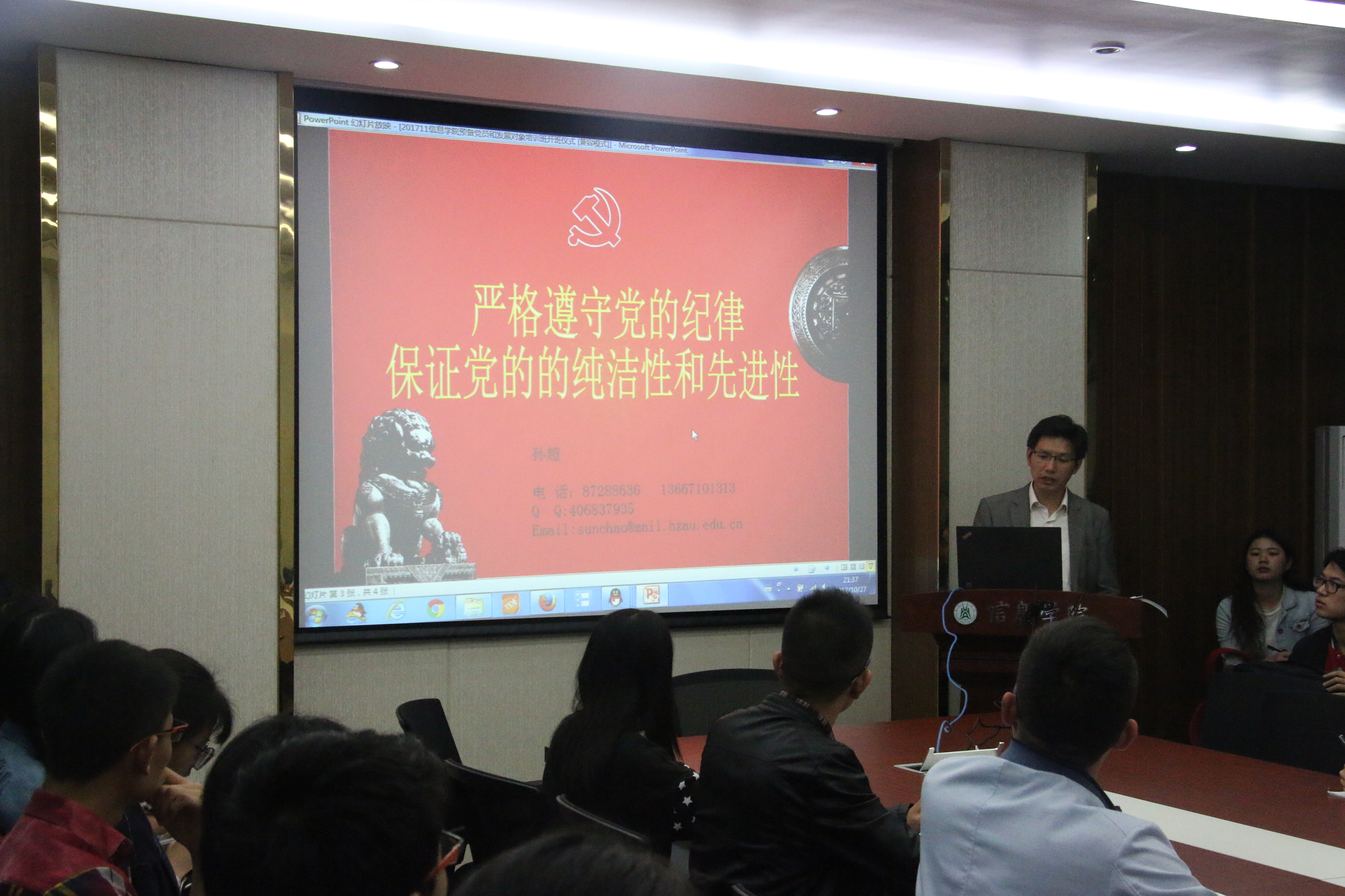 仪式后,孙超做了题为“严格遵守党的纪律,保证党的纯洁性和先进性”的辅导报告。孙超从“如何强调纪律”、“党的纪律是什么”、“大学生党员如何在遵守党纪方面做好表率”、“如何保持党的先进性”四点出发,通过视频素材和案例,向学员介绍了党规党纪,学员高彤表示,通过学习,进一步了解了党纪的重要性和严肃性,后面要更加主动学习,自觉要求自己,通过学习党章党规和习近平总书记系列讲话精神,争取早日成为一名中共党员。