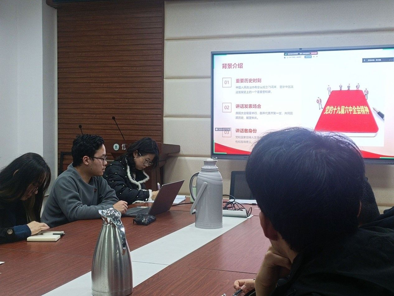 计科本科生第二党支部深入学习了习近平总书记在庆祝中国人民政治协商会议成立75周年大会上的重要讲话精神。刘适雨同志带领全体党员共同学习了中国共产党领导的多党合作和政治协商制度的重大意义,以及人民政协在政治协商、民主监督、参政议政中的重要作用,并详细解读了习近平总书记关于人民政协工作的十条规律性认识。