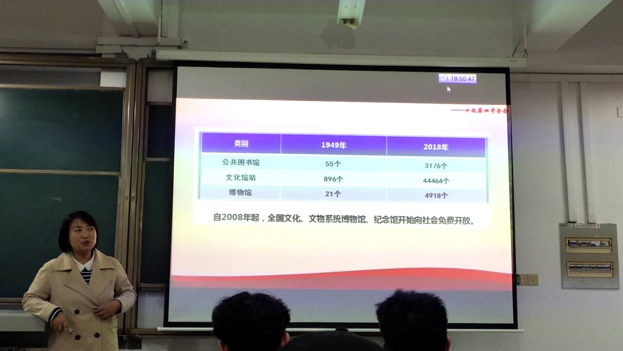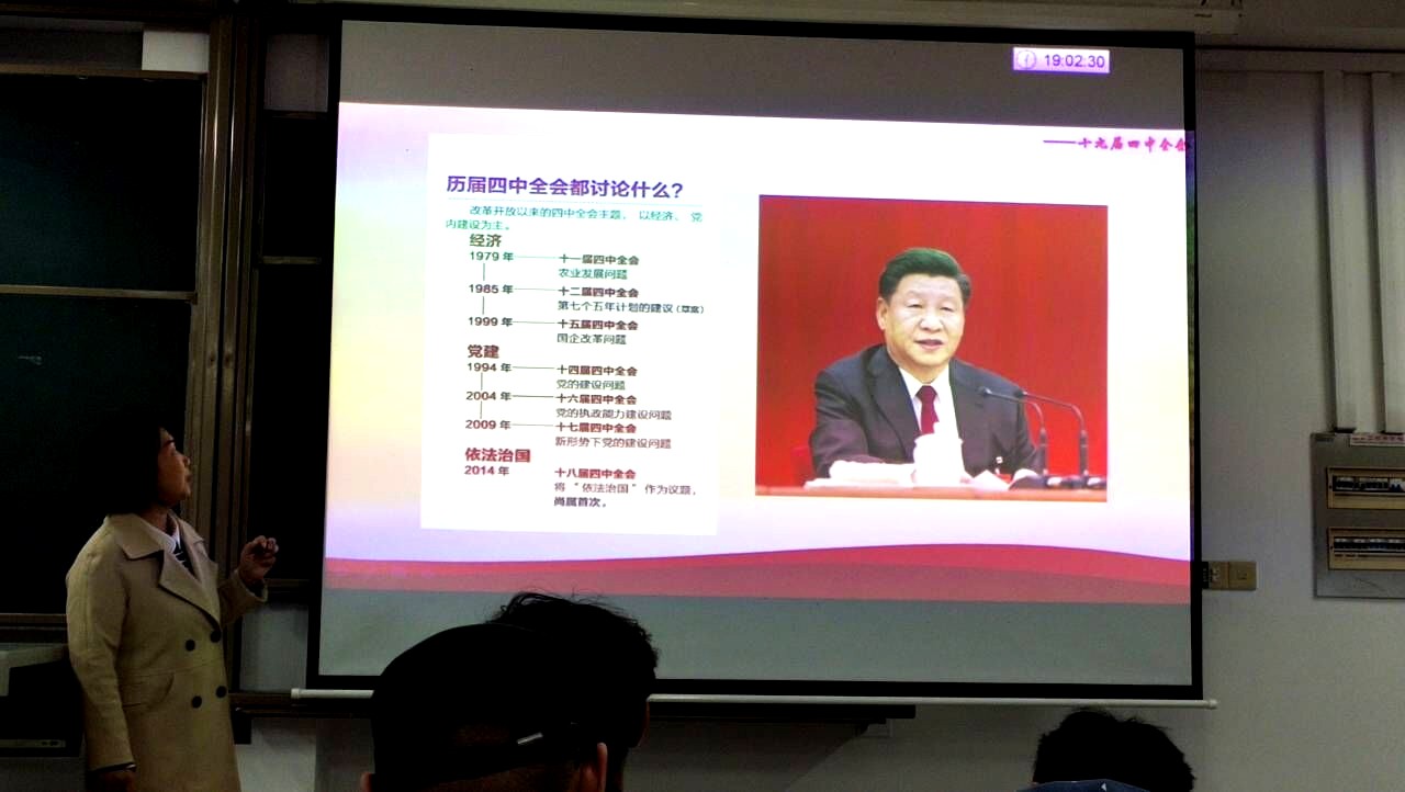 刘双老师首先就十九届四中全会的召开时间、参会人员及全会主要内容等基本情况进行了介绍,在其中强调十九届四中全会是第一次用中央全会讨论国家制度和国家治理。在了解全会基本情况后,入党积极分子们进行了对全会召开的时代背景的学习。刘双老师不仅强调了这次全会是在关键时期召开的一次重要会议,是“两个一百年”奋斗目标的历史交汇点,还向同学们讲解了“新三论”,使同学们对十九届四中全会的重要性有了更为全面的认识。