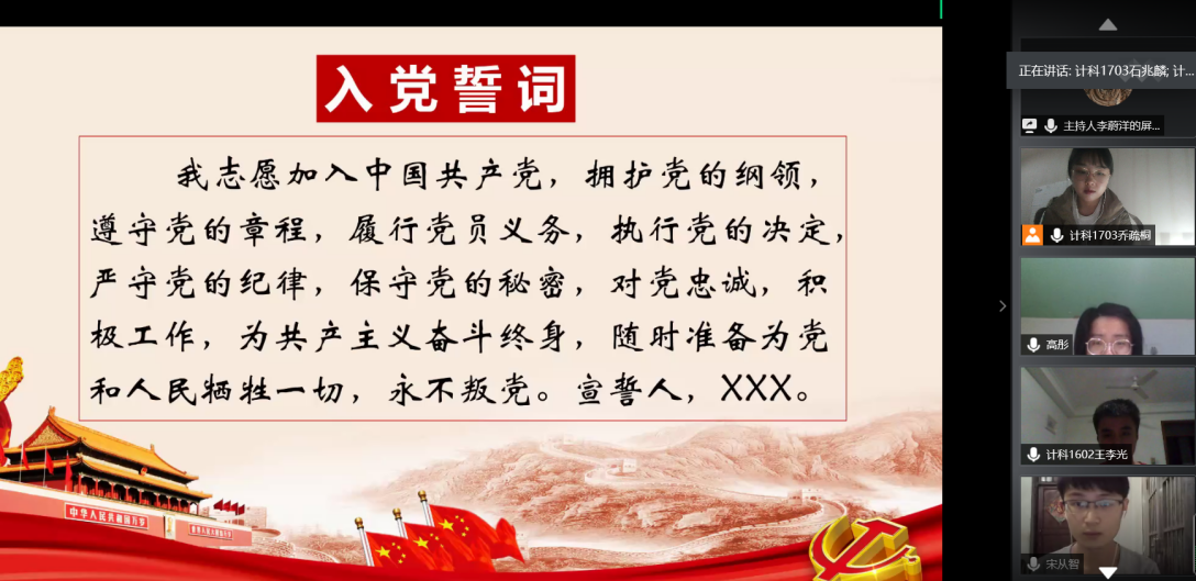 最后,全体党员在李博老师的带领下,打开摄像头,在线进行了“云宣誓”。誓词回响,《不忘初心》的歌声伴随着抗疫MV,为首期党员“先锋故事会”画上了圆满句号。